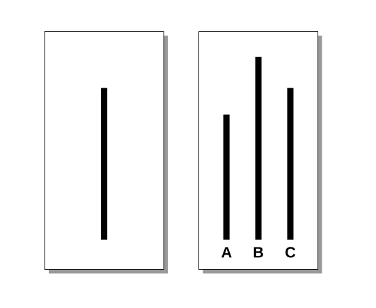 The researcher asks you to identify which line on the second image is the same length as the line on the first image. To you, dear reader, it likely seems obvious that Line C is the correct answer.